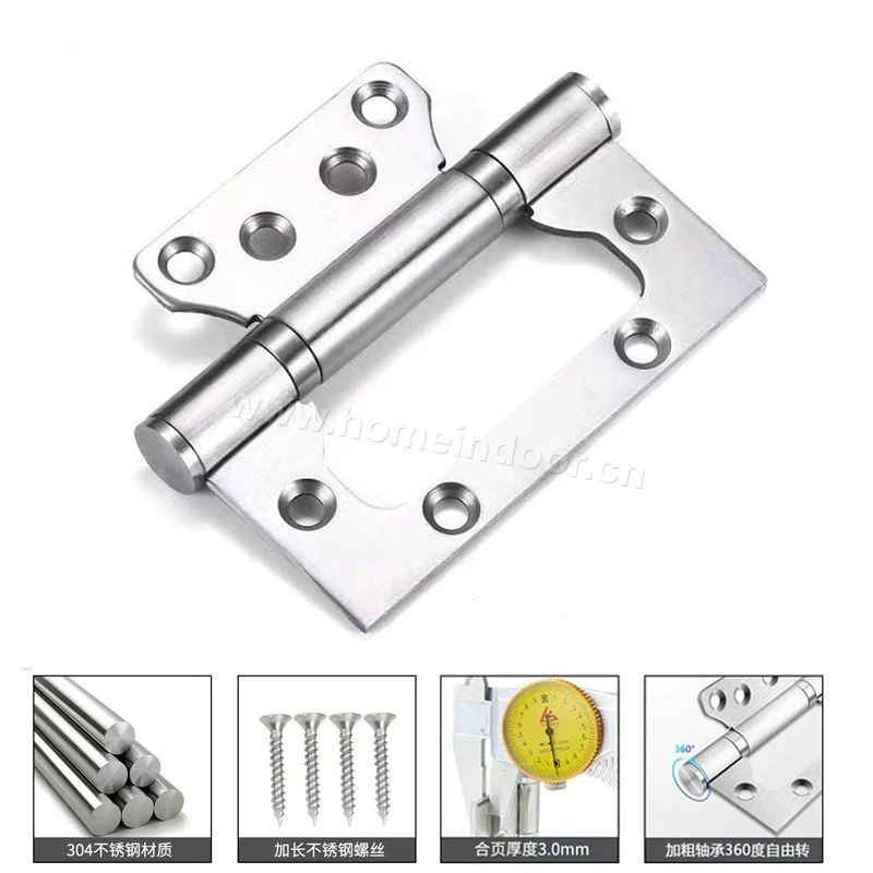 The stainless steel flush hinge for wood doors is a high-performance, precision-engineered hinge designed for strength, durability, and sleek appearance. Manufactured from premium 201, 304, or 316 stainless steel, this hinge offers excellent resistance to corrosion, wear, and environmental damage. Grade 201 provides solid performance for indoor applications, while 304 and 316 grades deliver enhanced resistance to rust and chemicals, making them ideal for humid or coastal environments.