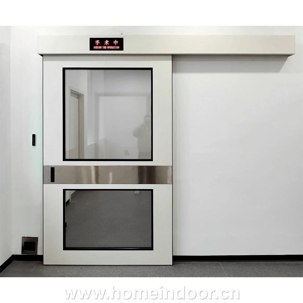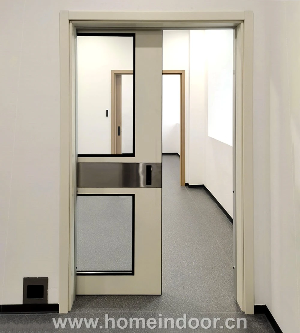 Designed for sterile hospital operating rooms, this automatic sliding door combines durability, hygiene, and advanced functionality. Constructed with a galvanized steel frame and a lightweight aluminum honeycomb core, it ensures strength while maintaining ease of operation. The door features a flush-mounted glass vision panel for clear visibility, aiding staff supervision without compromising the sterile environment. Finished with an antibiosis powder coating in a soft milk white color, it meets stringent infection control standards. Equipped with a heavy-duty automatic sliding system activated by a foot sensor switch, it offers reliable, hands-free access tailored for high-traffic surgical areas.
