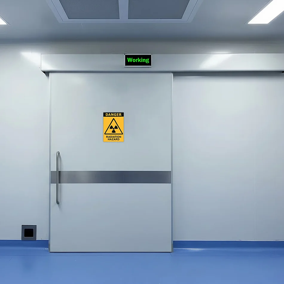 The exterior of the CT scan room door is finished with an anti-scratch stainless steel stretch plate, providing durability and protecting the door surface from wear and tear, especially in environments with hospital beds or equipment. This high-quality stainless steel finish is easy to clean and maintain, ensuring a hygienic environment. To further enhance safety, the door is often equipped with a radiation danger sign to alert people of the potential hazards. This signage acts as a visual reminder, ensuring that individuals are aware of the radiation risk and avoid coming too close to the door while the CT scan process is in use.