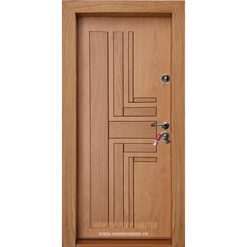 Pre:AMD57 Residential external entry brown oak veneer painted 4 panel steel-wood armour door