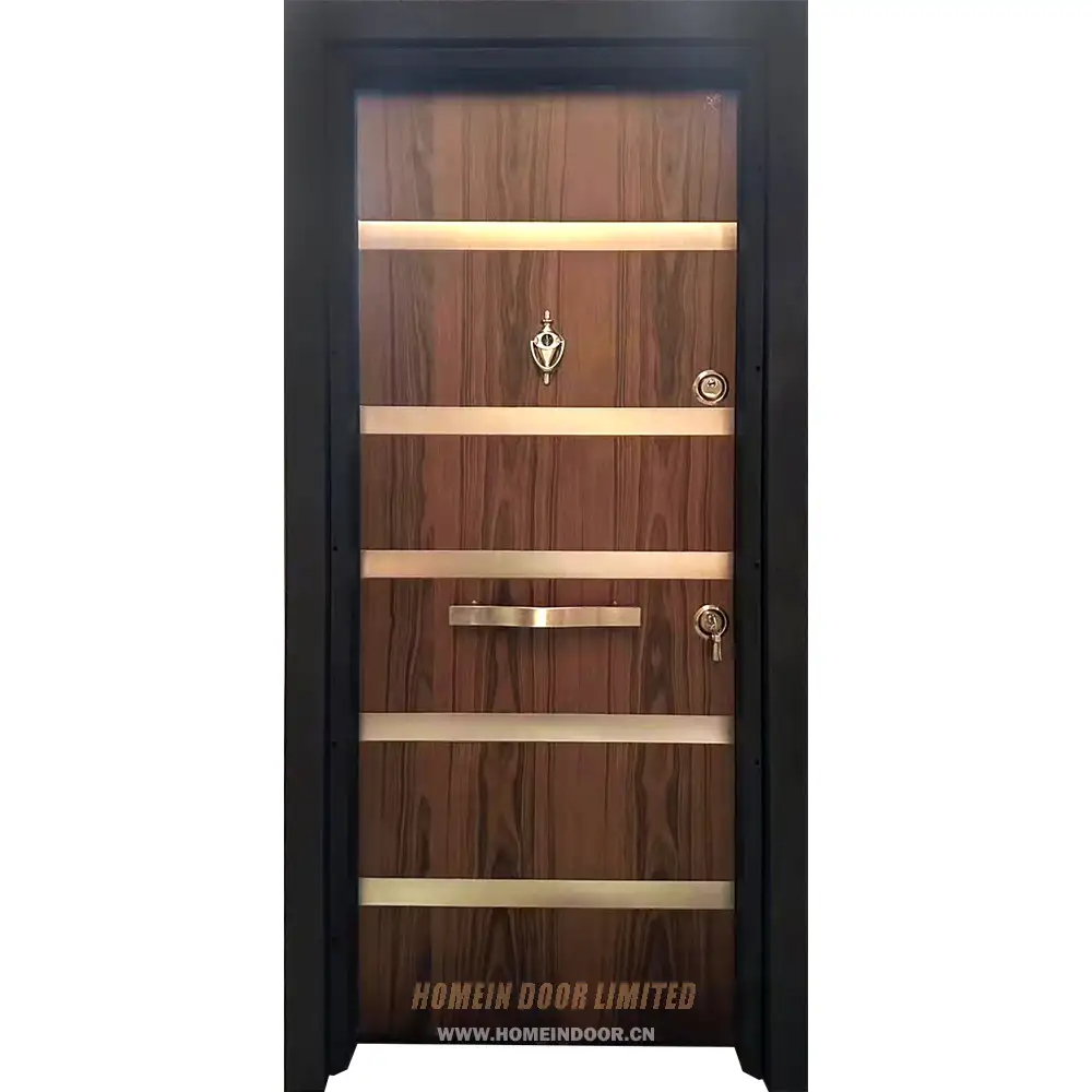 Next:Residential external entry brown walnut veneer painted grooved steel-wood armored door