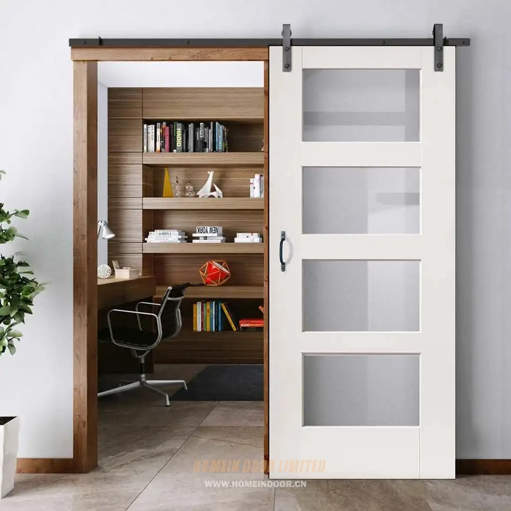 Pre:Wood shaker style four lite frosted glass barn door for bathroom