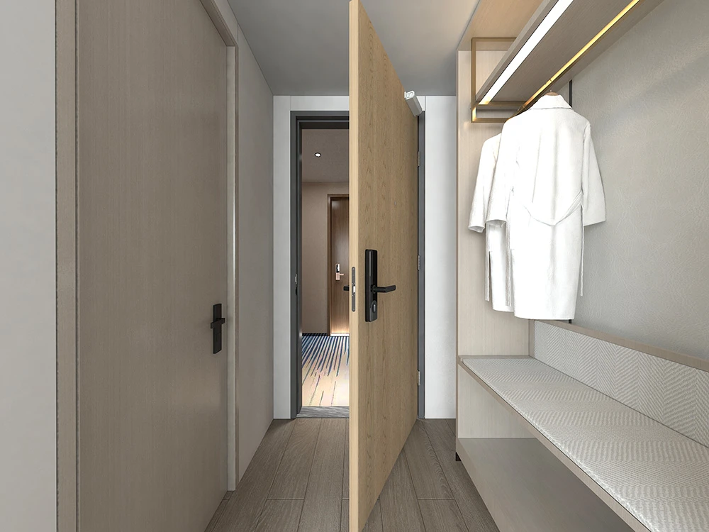 The design of a wooden hotel room door involves much more than simply creating an aesthetically pleasing entry. By focusing on the seven key considerations—aesthetics, fireproofing, sound isolation, durability, anti-scratch properties, environmental friendliness, and intelligence—hotel owners and designers can create doors that not only look great but also provide long-term value, safety, and comfort for guests. A thoughtfully designed hotel room door enhances both the guest experience and the operational efficiency of the hotel, making it a fundamental element in the overall success of the property.