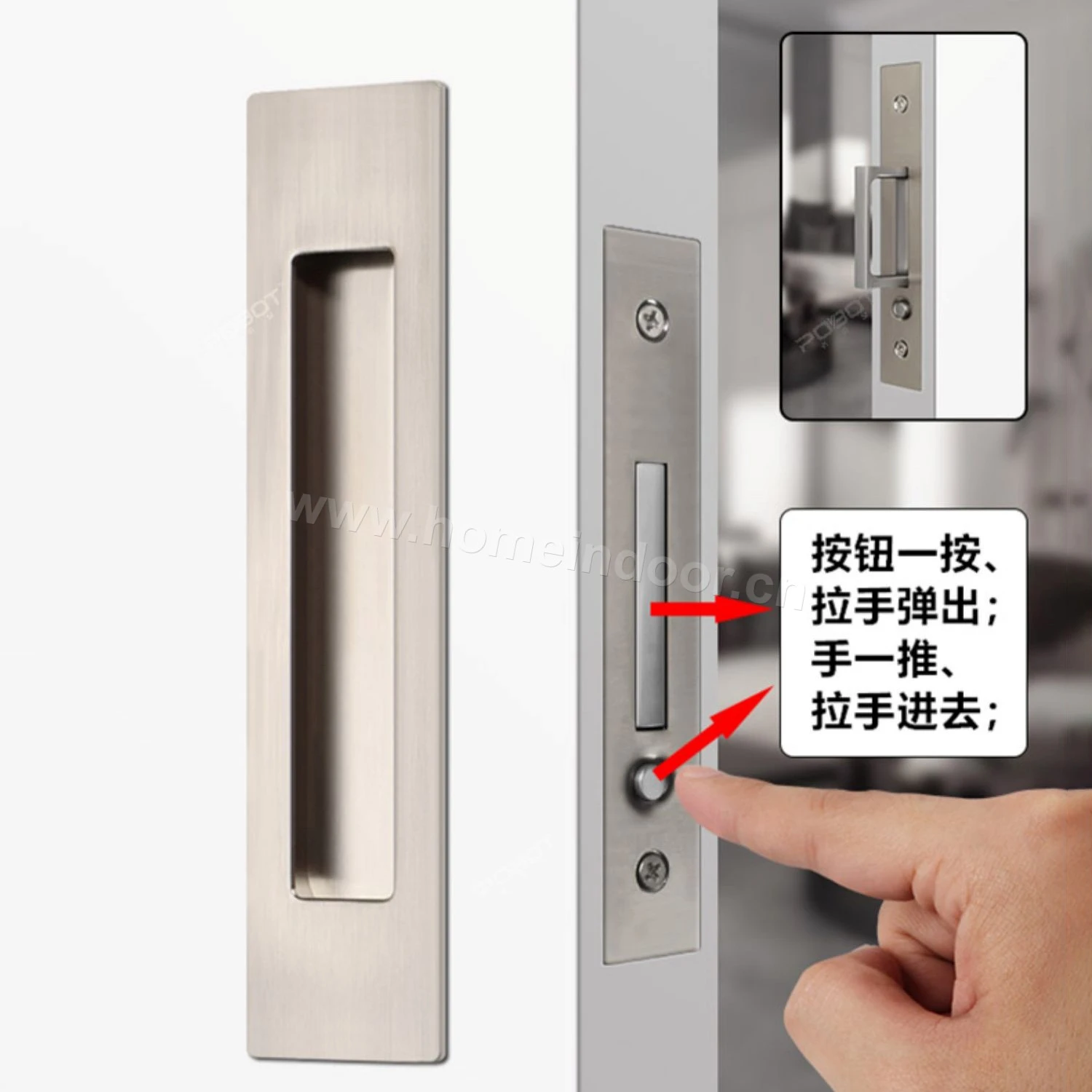 - Recessed Design: The handle is installed into a routed cavity in the door face or edge, sitting flush with the surface. This ensures the door can fully retract into the wall pocket.