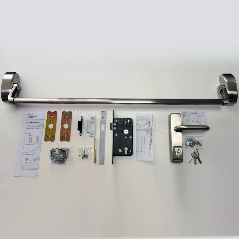 - Functionality: Horizontal push bar across the width of the door One-touch release mechanism for fast exit Non-handed design (works on left- or right-hand doors) Can be used on single or double doors (with optional vertical rods or strike plate)