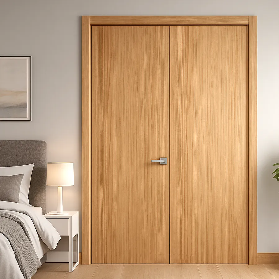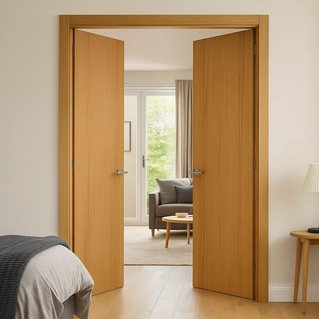 A sliced oak flush wood interior double bedroom door is both an elegant and functional design choice, especially for a large bedroom like a master suite. The double door configuration provides ample space for larger furniture pieces, such as king-size beds, dressers, or armoires, to pass through easily—ideal for rearranging or redecorating the room. This wider entrance offers both convenience and flexibility, ensuring that the room layout can be adapted as needed without hassle.