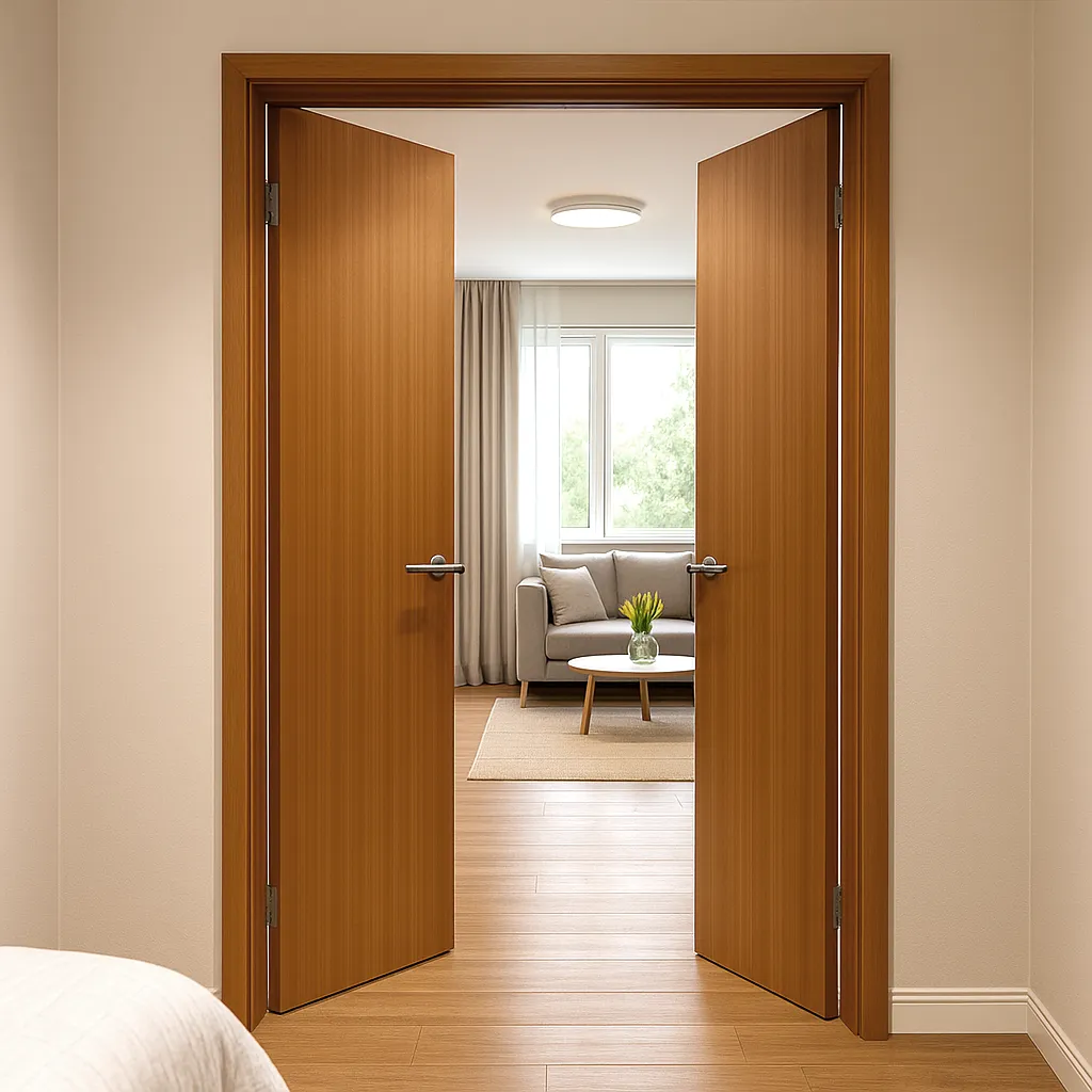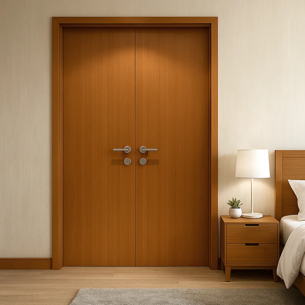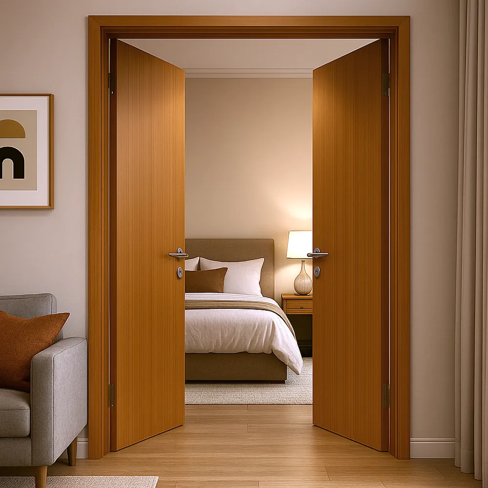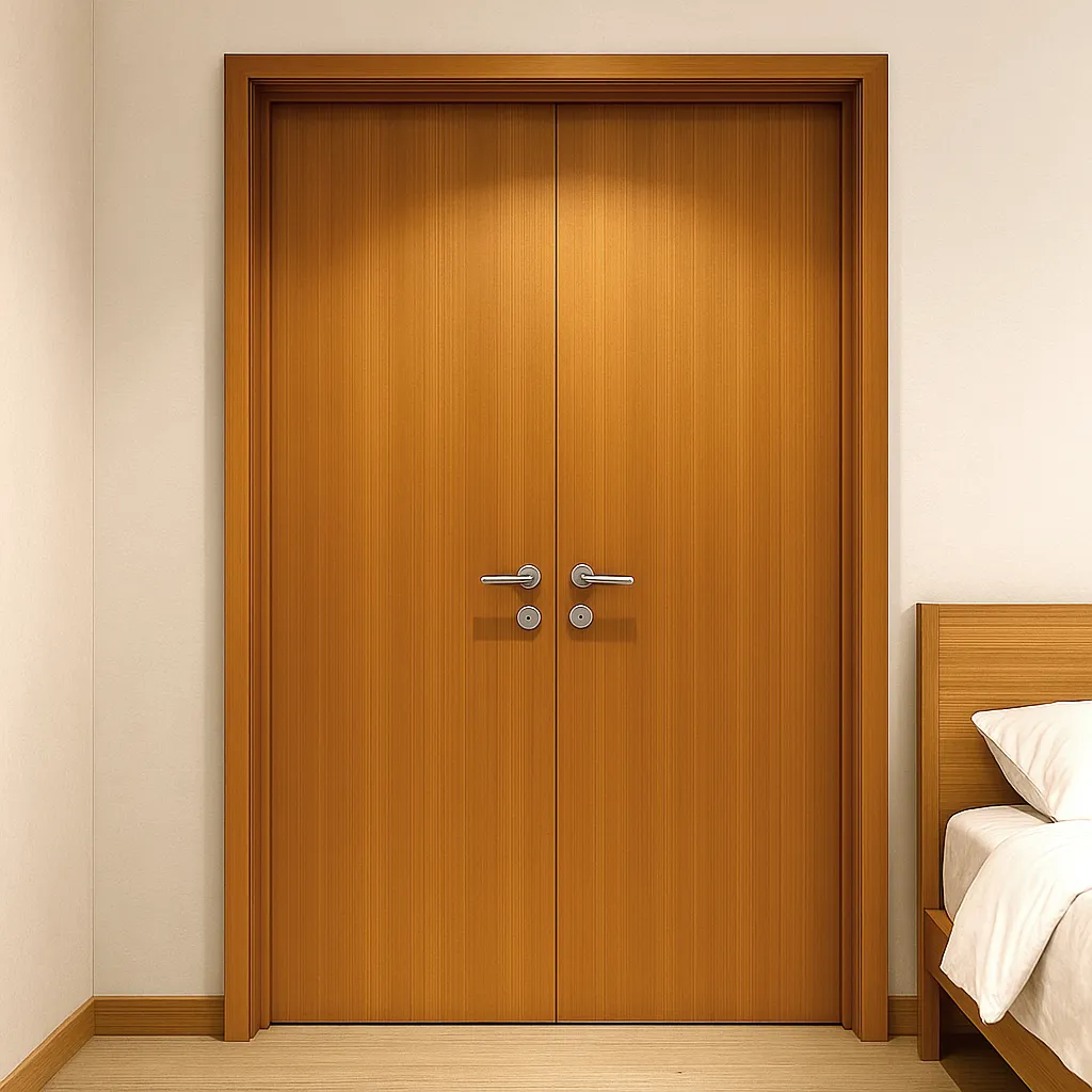 The golden color of the rift teak veneer adds warmth to the space, elevating the overall luxury of the room. This rich, natural hue complements a variety of interior styles, enhancing the feeling of elegance and tranquility. The flush design of the door—where the surface is smooth and seamless—reinforces the minimalist aesthetic, giving the room a sense of simplicity and sophistication. This type of design is ideal for modern interiors, where clean lines and subtle details are the focus.