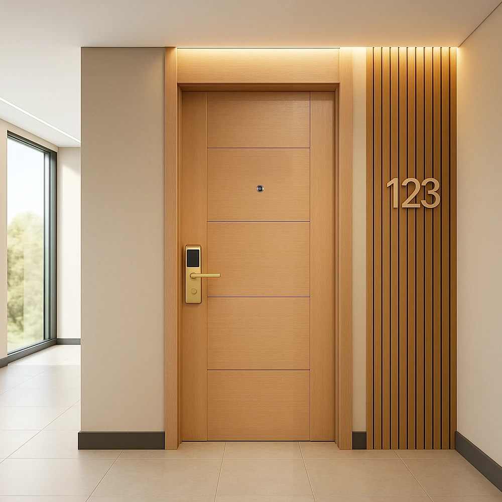 Aesthetic flexibility is key for hotel guest rooms, and this door provides a variety of design options to suit any interior theme. From sleek flush styles to traditional raised panel or shaker panel designs, and even more luxurious options with metal inlays, the door can be customized to fit any décor, from modern minimalism to classic elegance. The door is finished with a high-quality water-based paint, which is not only eco-friendly but also available in an unlimited range of colors and textures, allowing it to complement any hotel’s design vision.