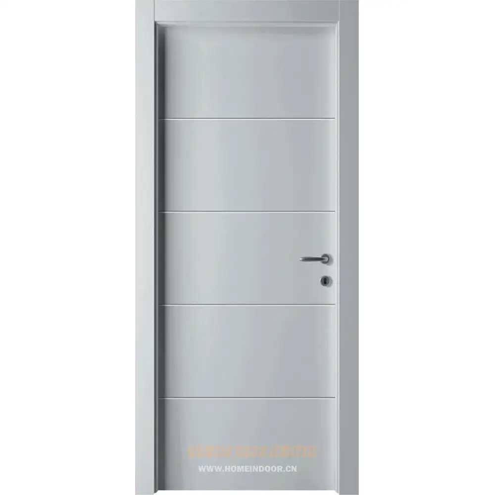 The door features a clean, flush design with horizontal V-grooves, adding a modern touch to any space while maintaining a smooth, streamlined appearance. The white paint finish enhances its sleek and contemporary look, making it suitable for various residential and commercial applications.