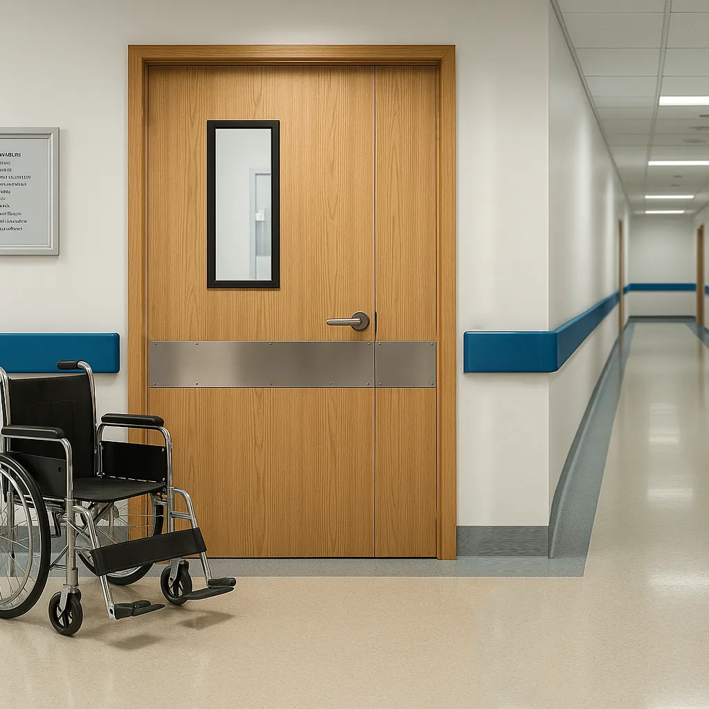 Additionally, the door features an advanced anti-biosis finish, which resists the growth of harmful bacteria, including Escherichia coli, Staphylococcus aureus, Candida albicans, Klebsiella pneumoniae, Pseudomonas aeruginosa, Salmonella enterica, Enterococcus faecalis, and Methicillin-resistant Staphylococcus aureus (MRSA). This antimicrobial treatment helps reduce the risk of cross-contamination, making the door an important part of maintaining a clean and safe environment for both patients and healthcare workers.