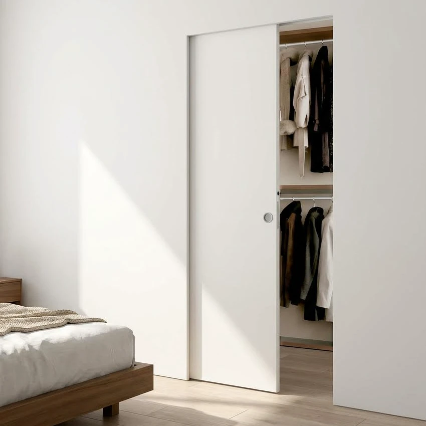 Pre:Interior bedroom white flush floor to ceiling trimless pocket sliding d