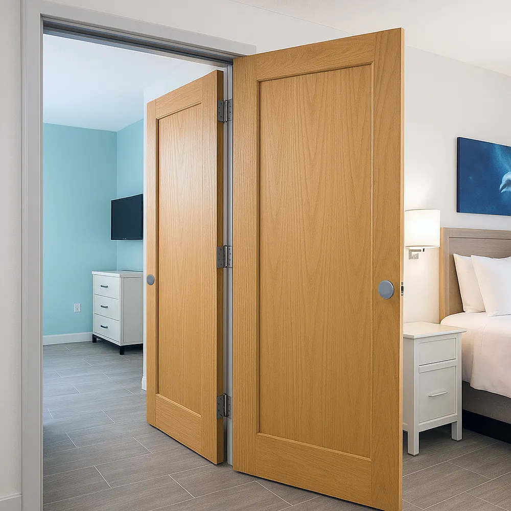 A hotel connecting door features a robust frame with two leaves—one for the inside room and one for the outside. Each leaf opens independently, allowing guests to move between the rooms while maintaining privacy and security. This design ensures both ease of access and separation, offering guests the flexibility of connecting rooms without leaving the hotel suite. The two-leaf setup is ideal for maintaining a seamless connection between adjoining rooms, making it convenient for families or groups who need more space but want to stay close together.