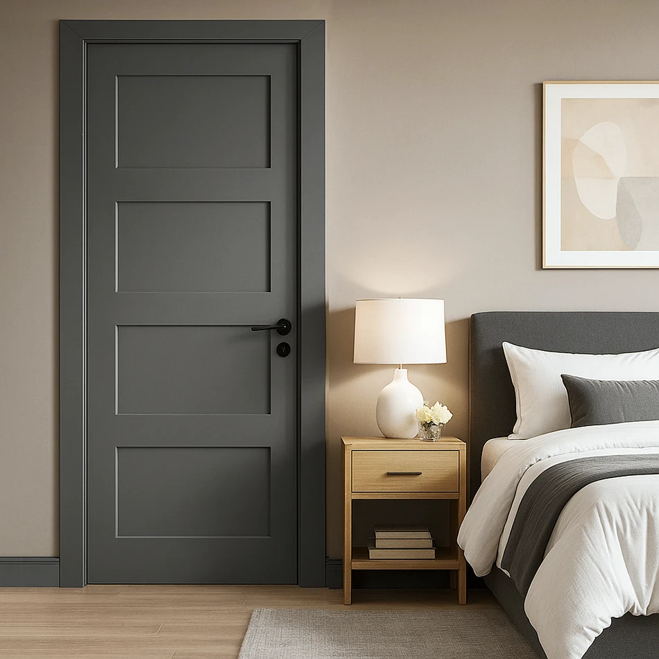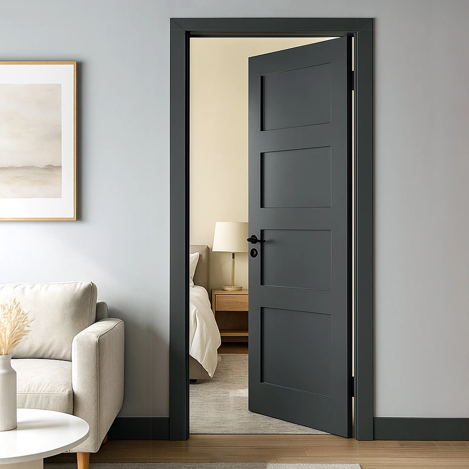 The Black Shaker Interior Door is a perfect fusion of classic charm and modern design, tailored to enhance any interior room. Featuring a four-panel shaker design with four equally flat center panels, this door offers a clean, minimalist aesthetic that fits seamlessly into both traditional and contemporary spaces. Its bold matte black finish adds sophistication and depth to your home decor, making it a standout feature in living rooms, bedrooms, or offices.