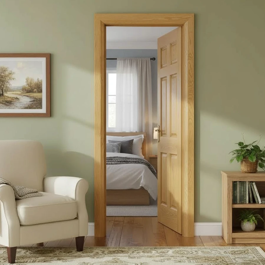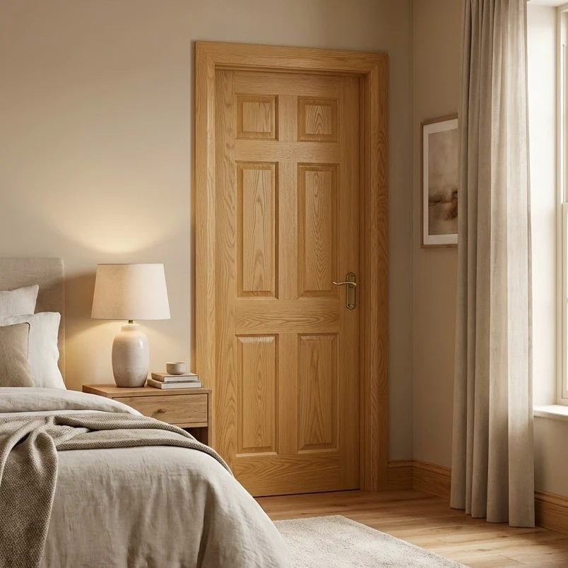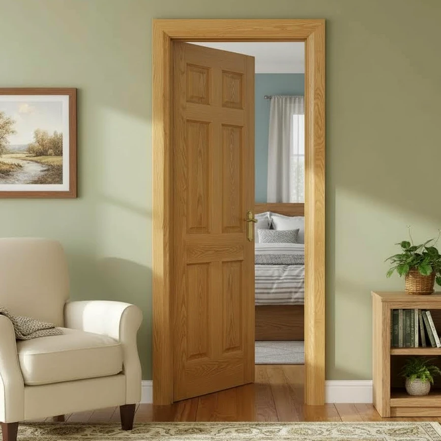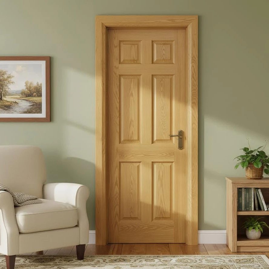 The Prehung Bedroom Oak 6-Panel Solid Wood Interior Door is crafted from premium North American oak, offering a perfect balance of durability and natural elegance. Its classic 6-raised panel design adds depth and sophistication to any space. The door features traditional stile and rail construction, ensuring exceptional strength and timeless beauty. Finished with environmentally friendly water-based paint, it not only looks stunning but also contributes to a more eco-conscious home. Built with strict moisture control processes and designed to resist bending and cracking, this door is ideal for high-end residential apartments, villas, and luxury bedrooms.